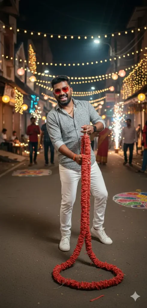 A stylish young man, face in realistic (a face reference) celebration with diwali in street background, my han in 10000 walar red Garland crackers in the rode. Grey popcorn shirt, white jean and white shoe, red frame sunglasses. Standing stylish funny pose. Captured in ultra-detailed 8H resolution with sharp textures natural skin tones, realistic shadows