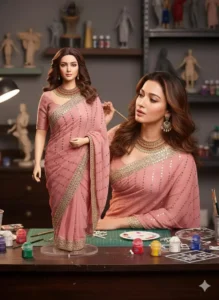 A hyper-realistic cinematic scene featuring the uploaded person carefully painting his own figurine at a desk. The figurine is standing on a transparent acrylic display base, but its size is larger than usual, making it appear more prominent and almost half the height of the real person. Both the person and the figurine wear the exact same outfit, matching in details. Around the desk, realistic painting tools, brushes, and hobby items are scattered, creating a creative workshop atmosphere. The figurine must look ultra-realistic with lifelike human skin tone, natural facial details, and premium PVC texture. Realistic indoor background, cinematic studio lighting, and sharp details.